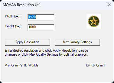 Small (82kb) program to automatically detect the config files for the Medal of Honor : Allied Assault series of games, allowing the user to easily set a custom resolution that isn’t supported by the games menus, it also give the user the ability to set maximum graphics settings with a single click.
